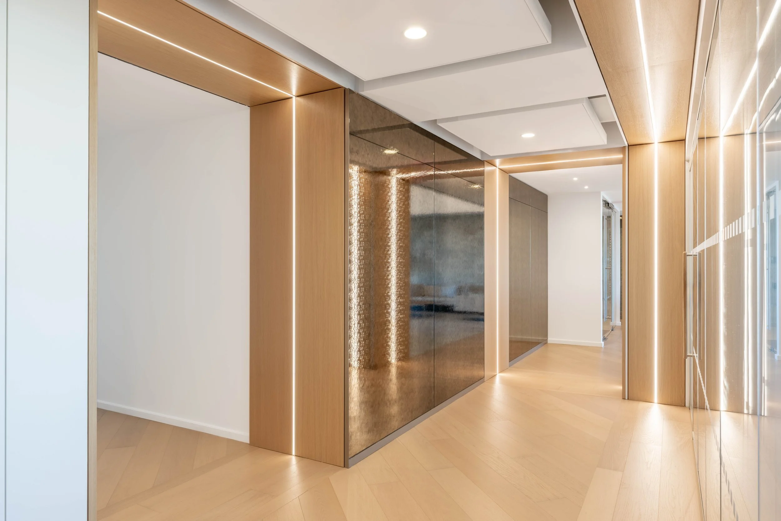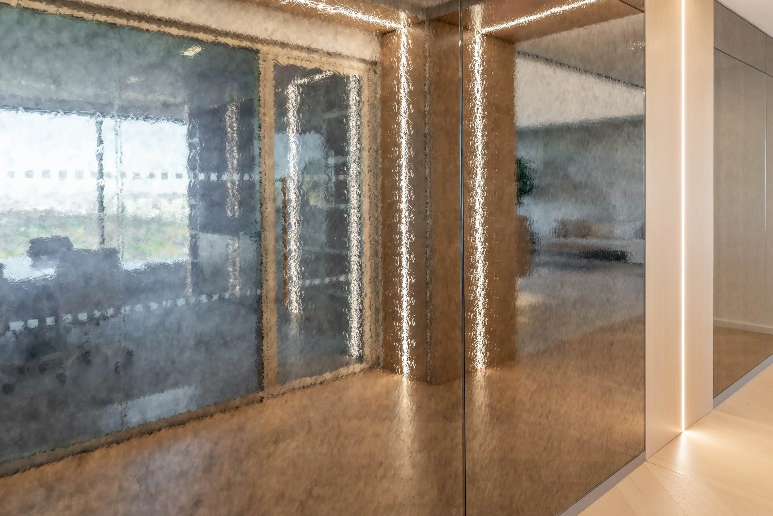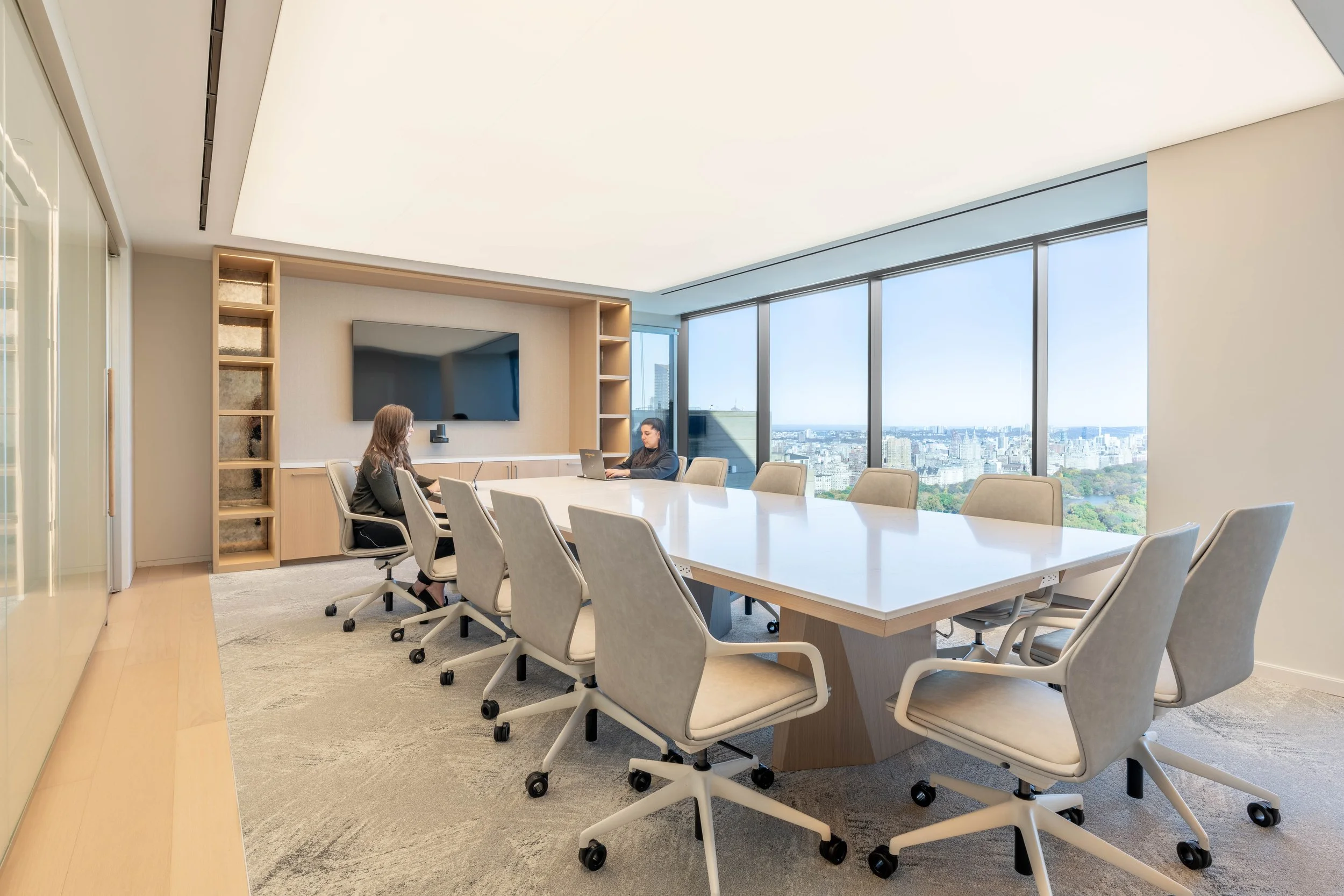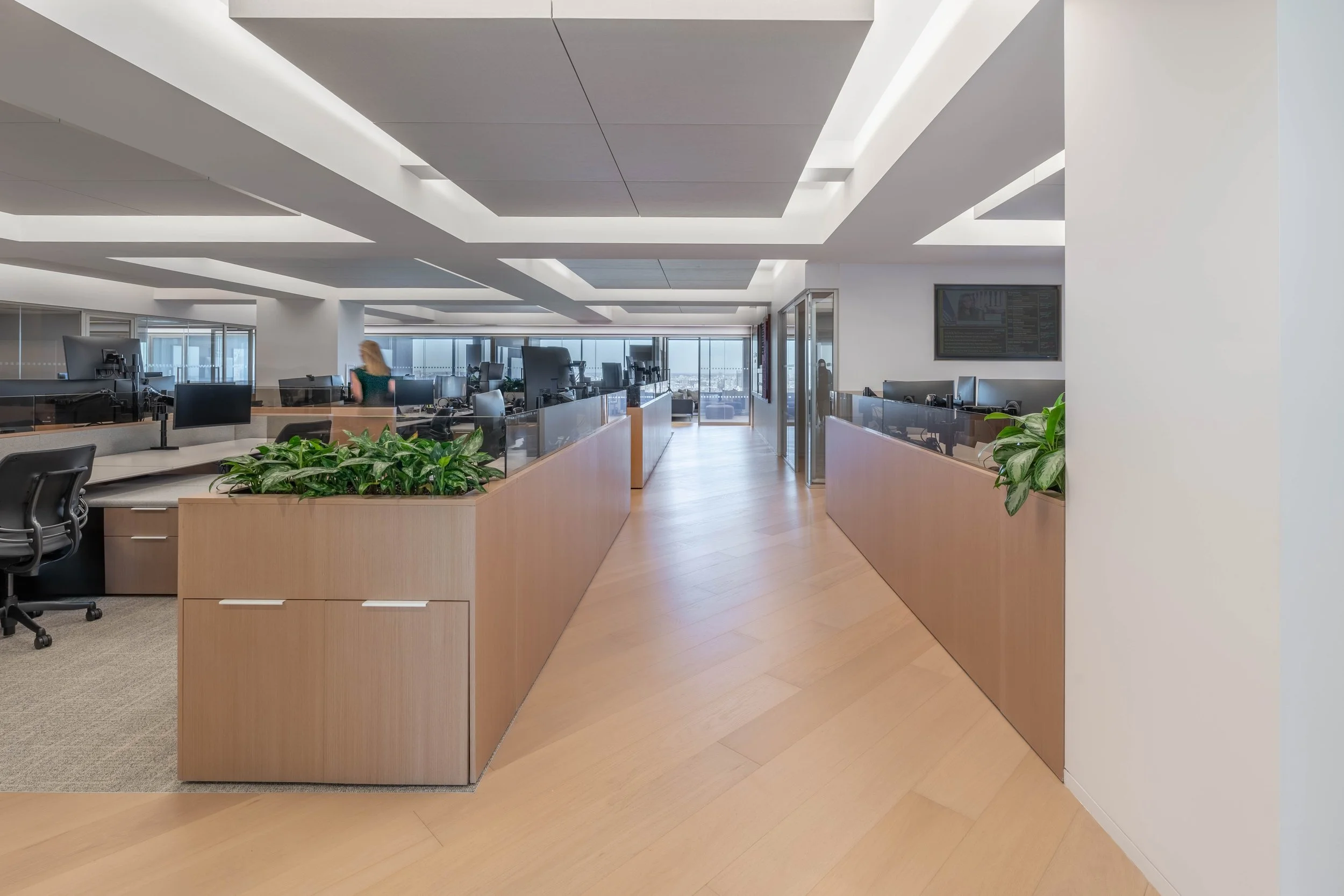 This workspace exemplifies a refined balance between openness and structured flow, where transparent partitions and clean architectural lines guide both movement and sightlines. Natural materials and soft textures temper the corporate formality, fostering a calm but focused atmosphere, while the strategic placement of lighting and furnishing zones enhances both collaboration and quiet concentration.