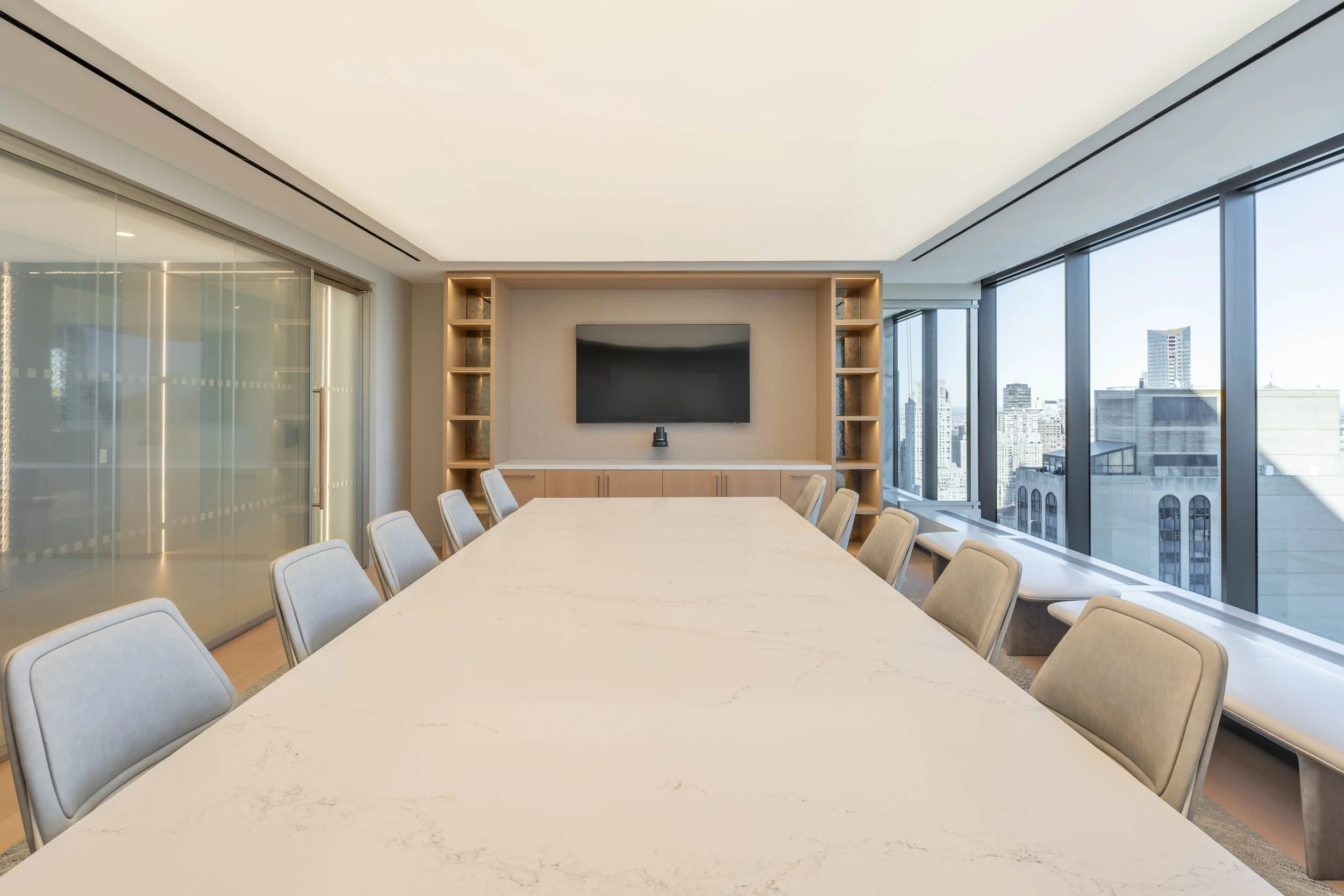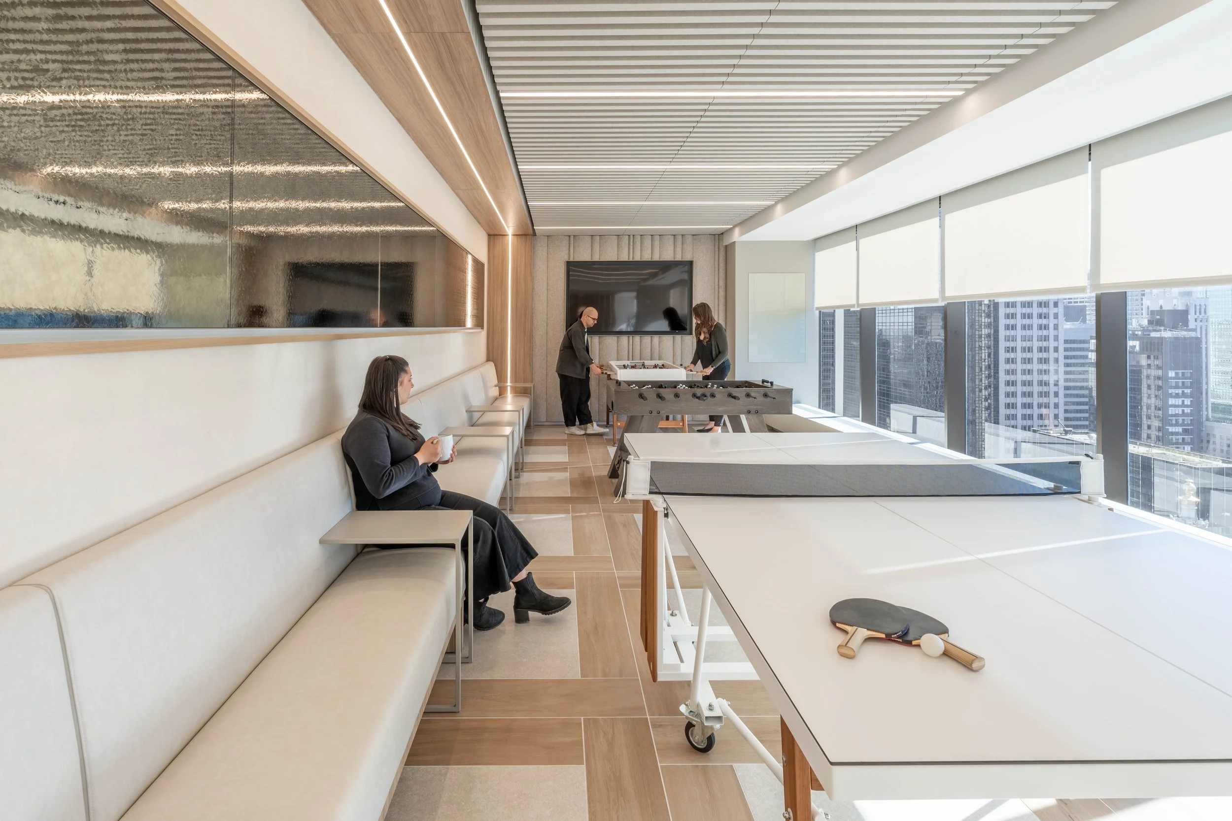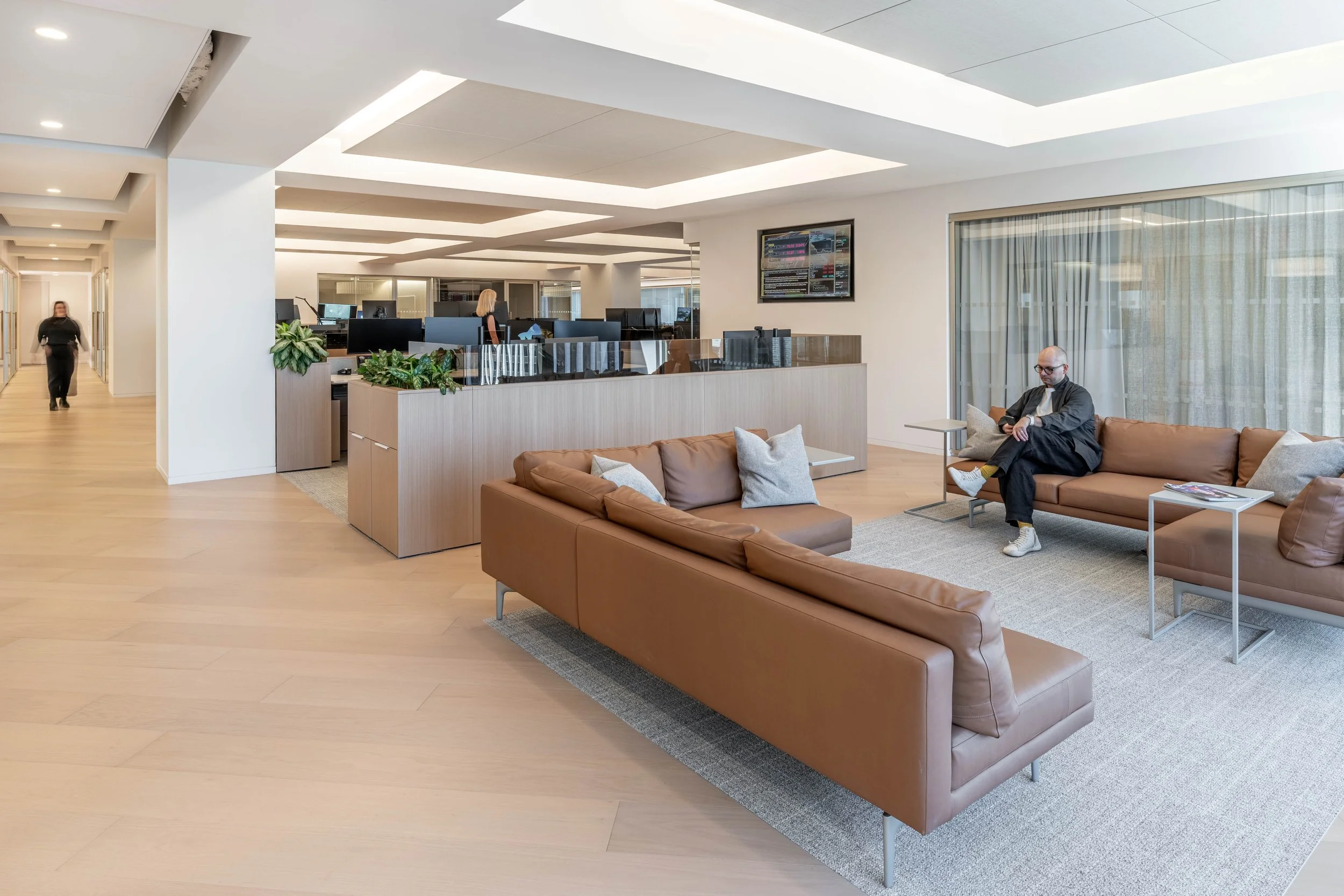 This workspace exemplifies a refined balance between openness and structured flow, where transparent partitions and clean architectural lines guide both movement and sightlines. Natural materials and soft textures temper the corporate formality, fostering a calm but focused atmosphere, while the strategic placement of lighting and furnishing zones enhances both collaboration and quiet concentration.