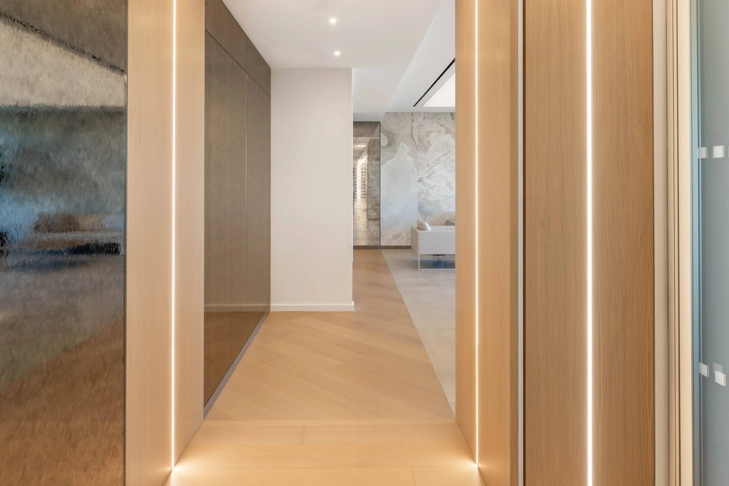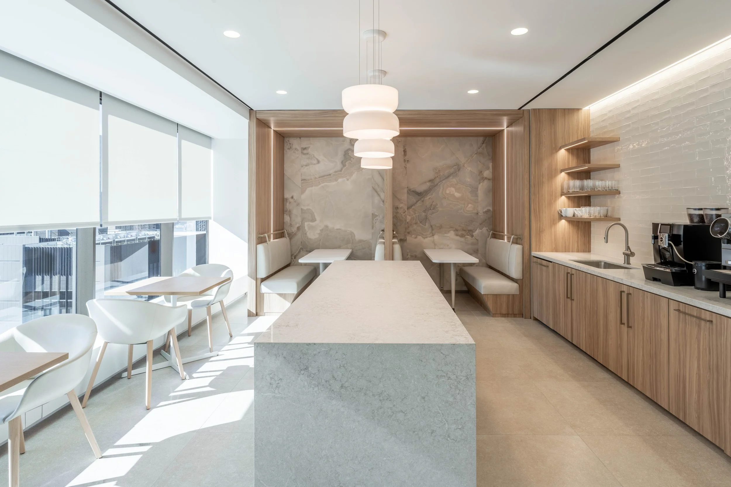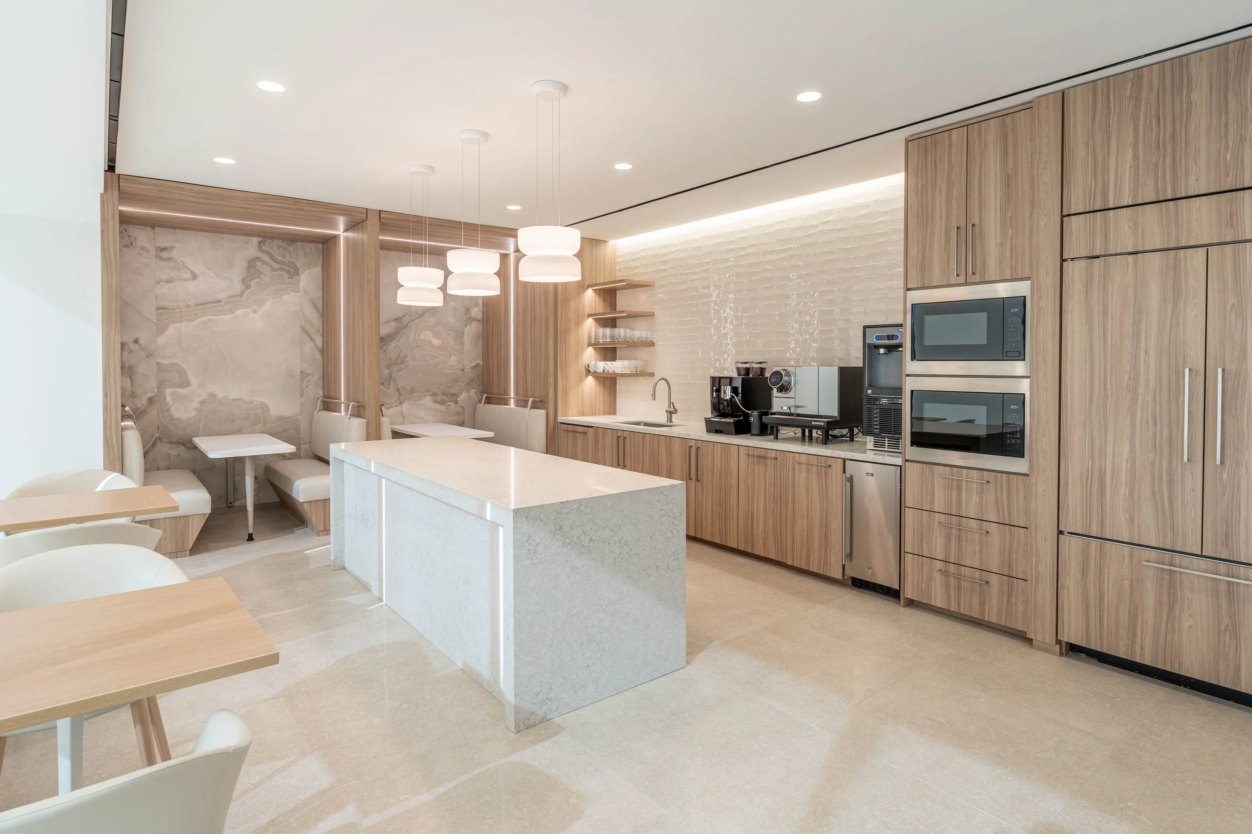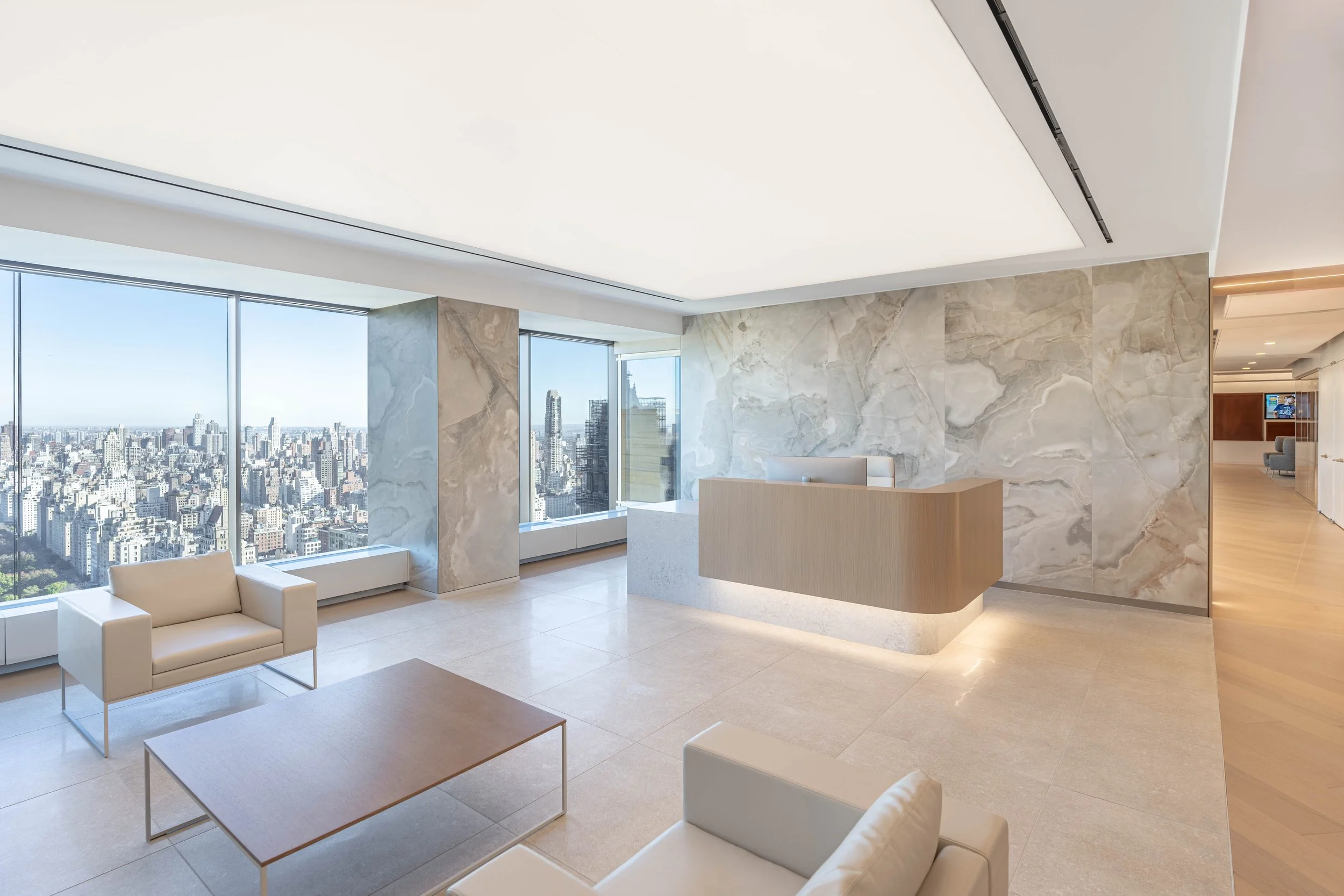 This workspace exemplifies a refined balance between openness and structured flow, where transparent partitions and clean architectural lines guide both movement and sightlines. Natural materials and soft textures temper the corporate formality, fostering a calm but focused atmosphere, while the strategic placement of lighting and furnishing zones enhances both collaboration and quiet concentration.