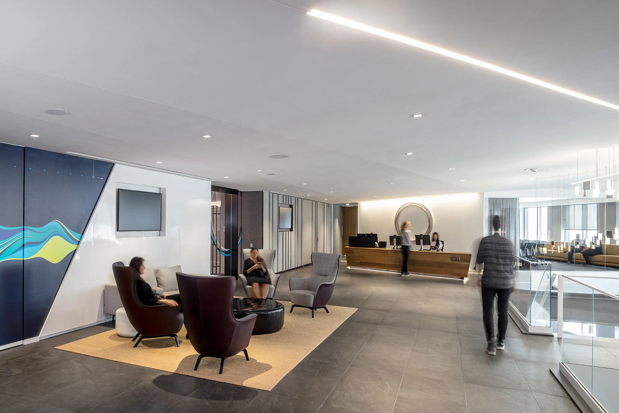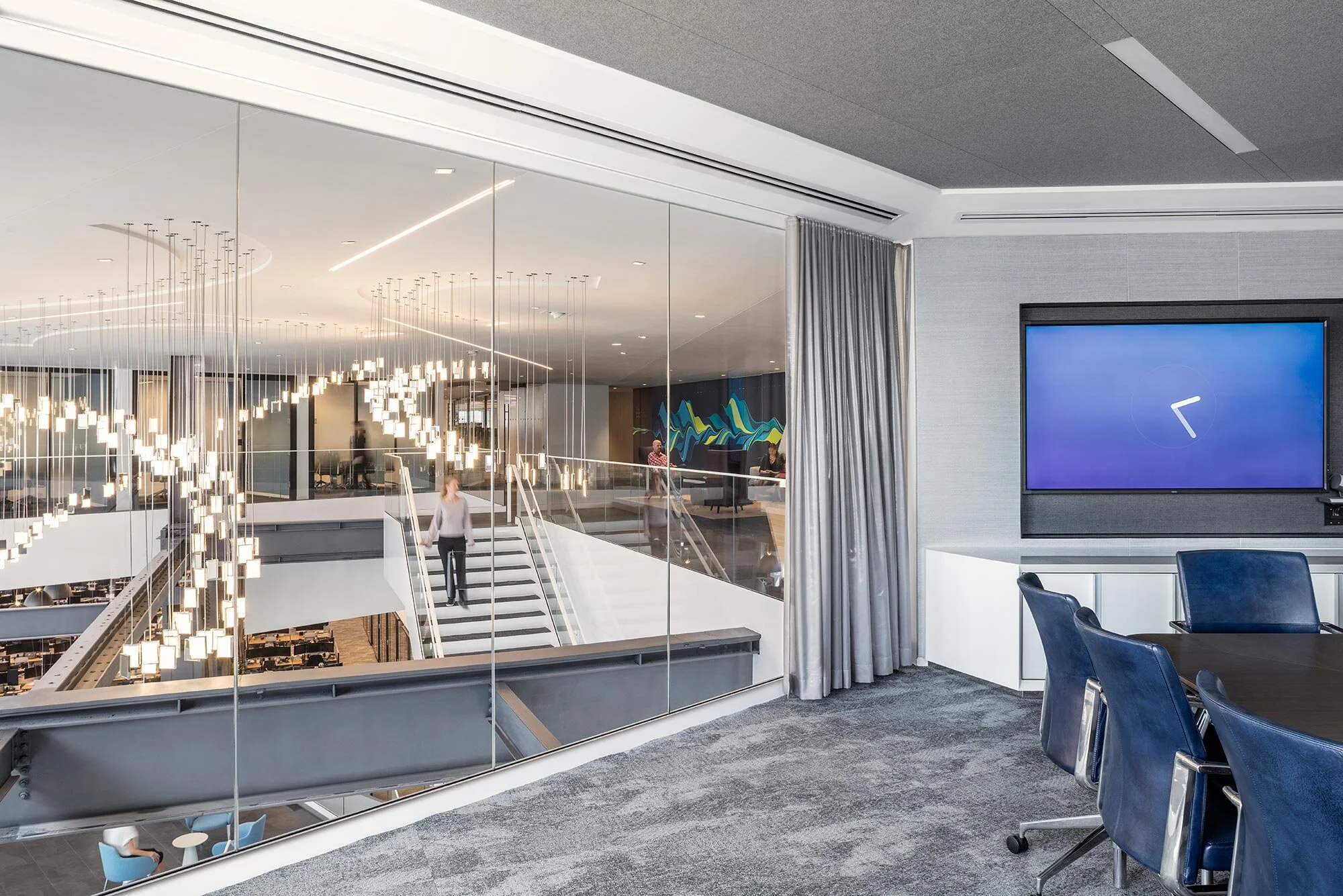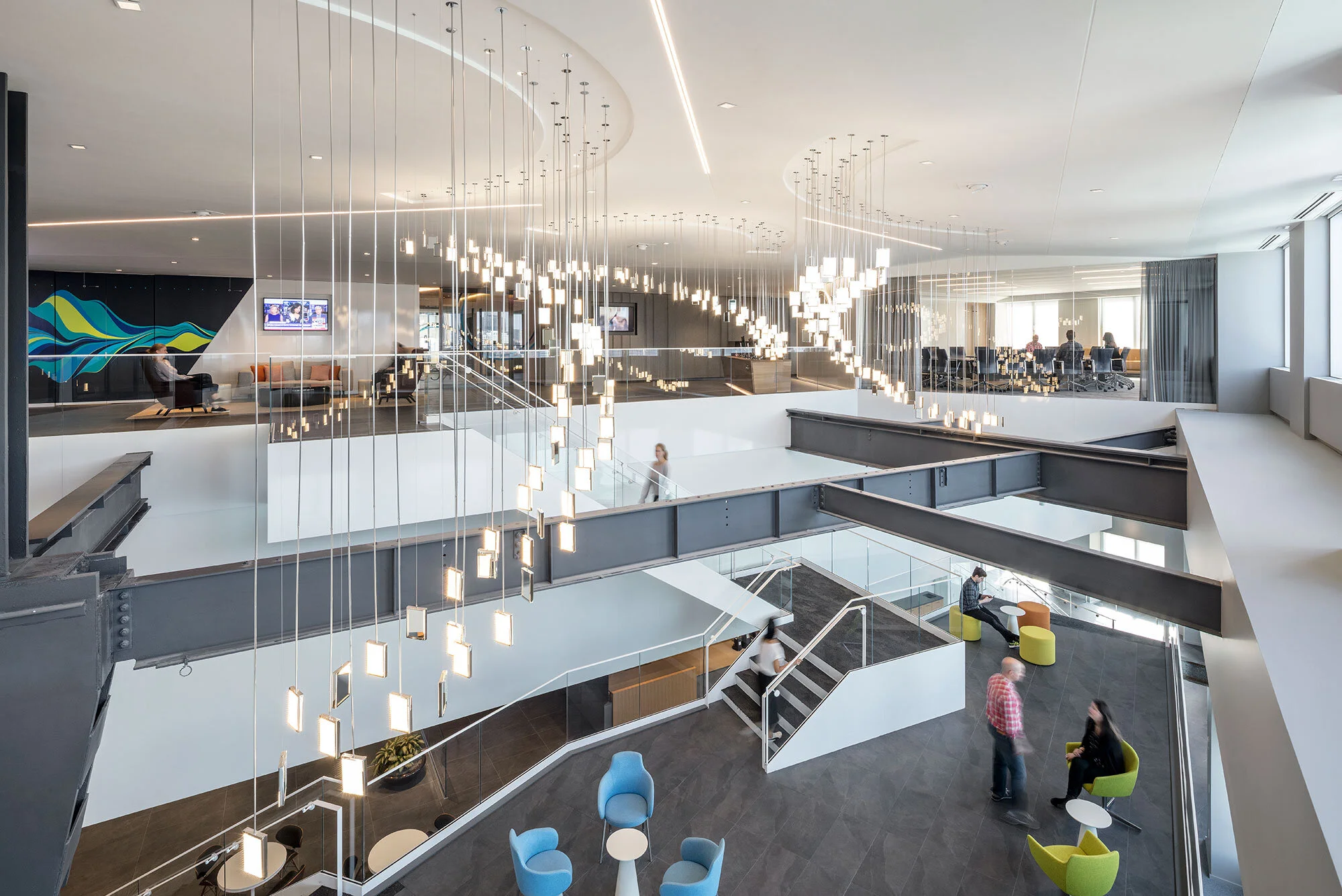 This client’s headquarters were designed according to WELL standards to improve the nutrition, fitness, mood, sleep patterns, and performance of its occupants. Some of the WELL design components include access to abundant natural light, daylight harvesting, and energy efficiency through an automated temperature control system.