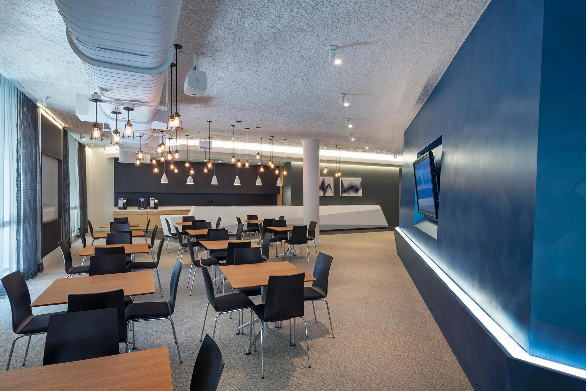 The seating continues into the café where the large amount of surface area is used to lay food out buffet-style after lectures.