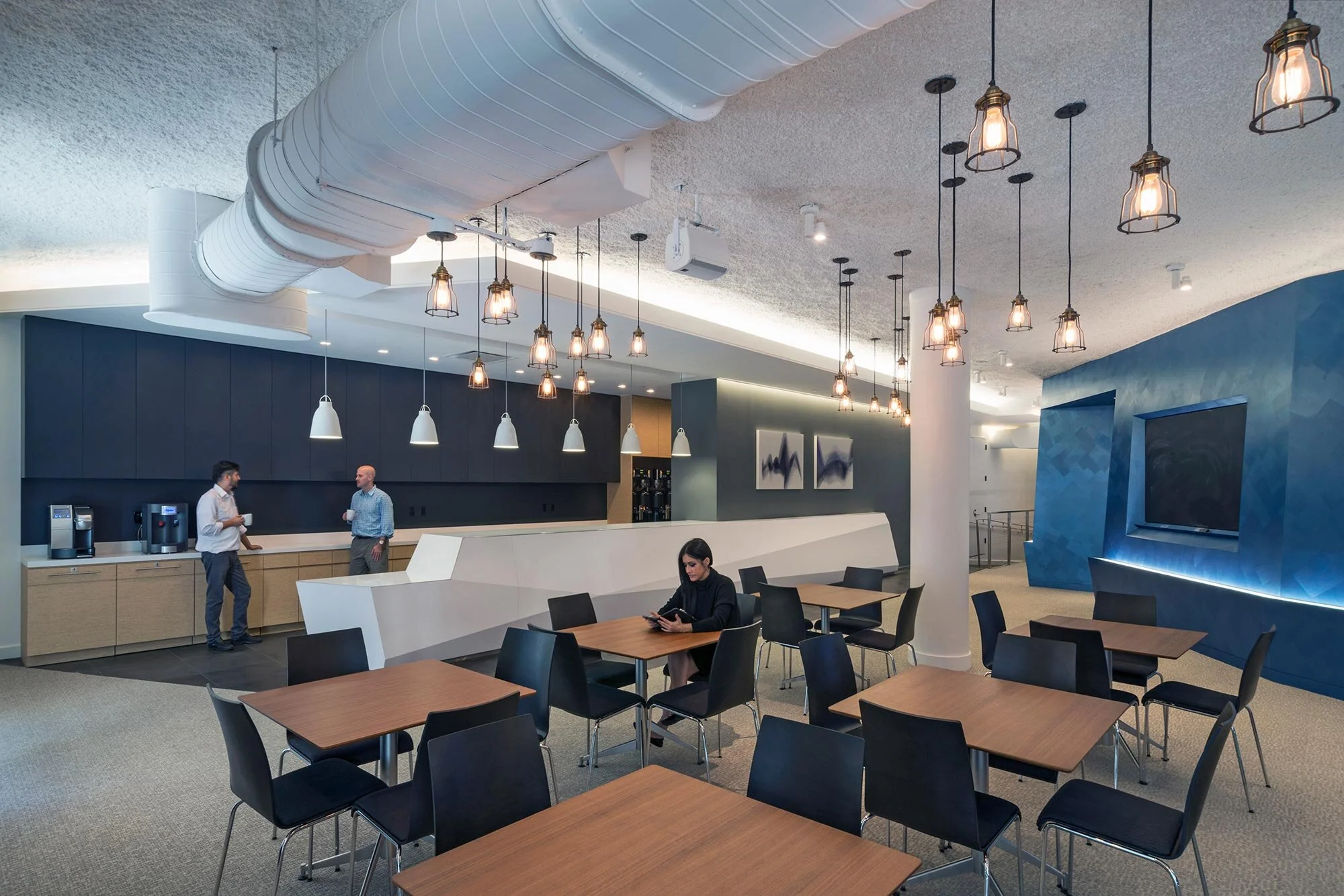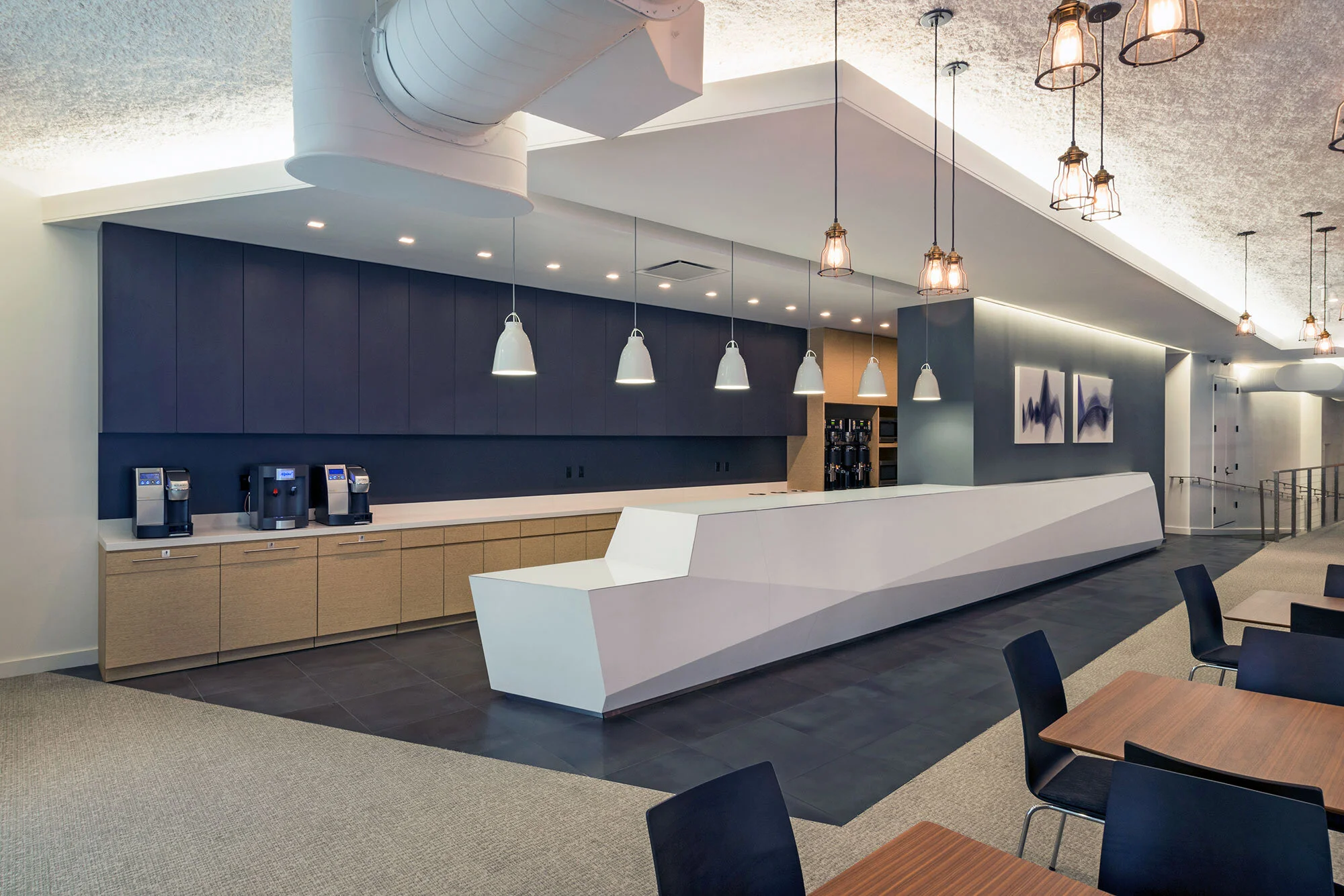 The floors are carpeted with a durable fabric to account for the large volume of visitors using the space.