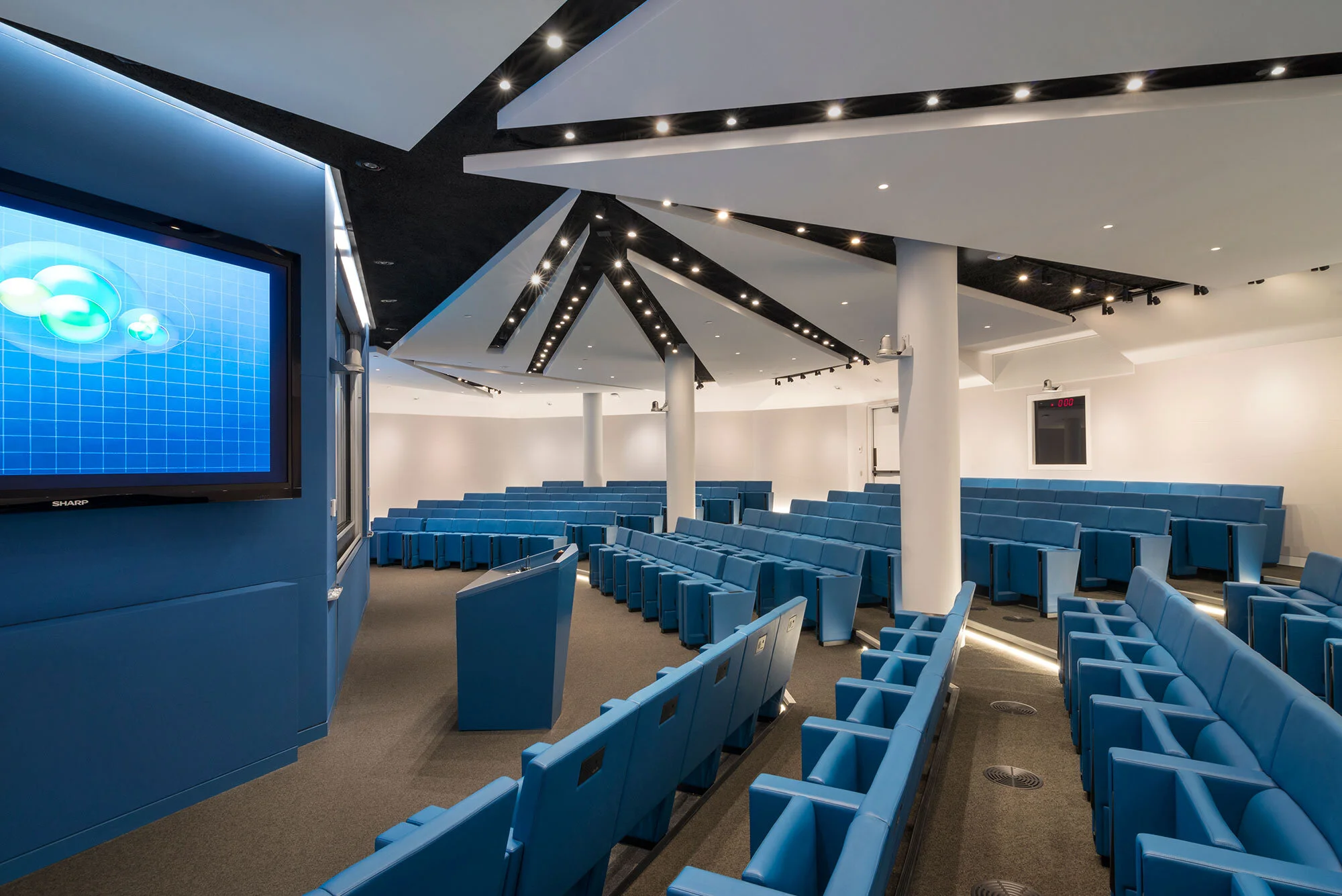 Within the auditorium, all 170 seats in circular rising sections have access to outlets, speakers, and a push button to ask to speak. The 14-foot ceilings can accommodate rolling blackboards that can be stacked 12 feet high for long equations. Each seat has a view of one of the large screens, even with four large columns standing in the space.