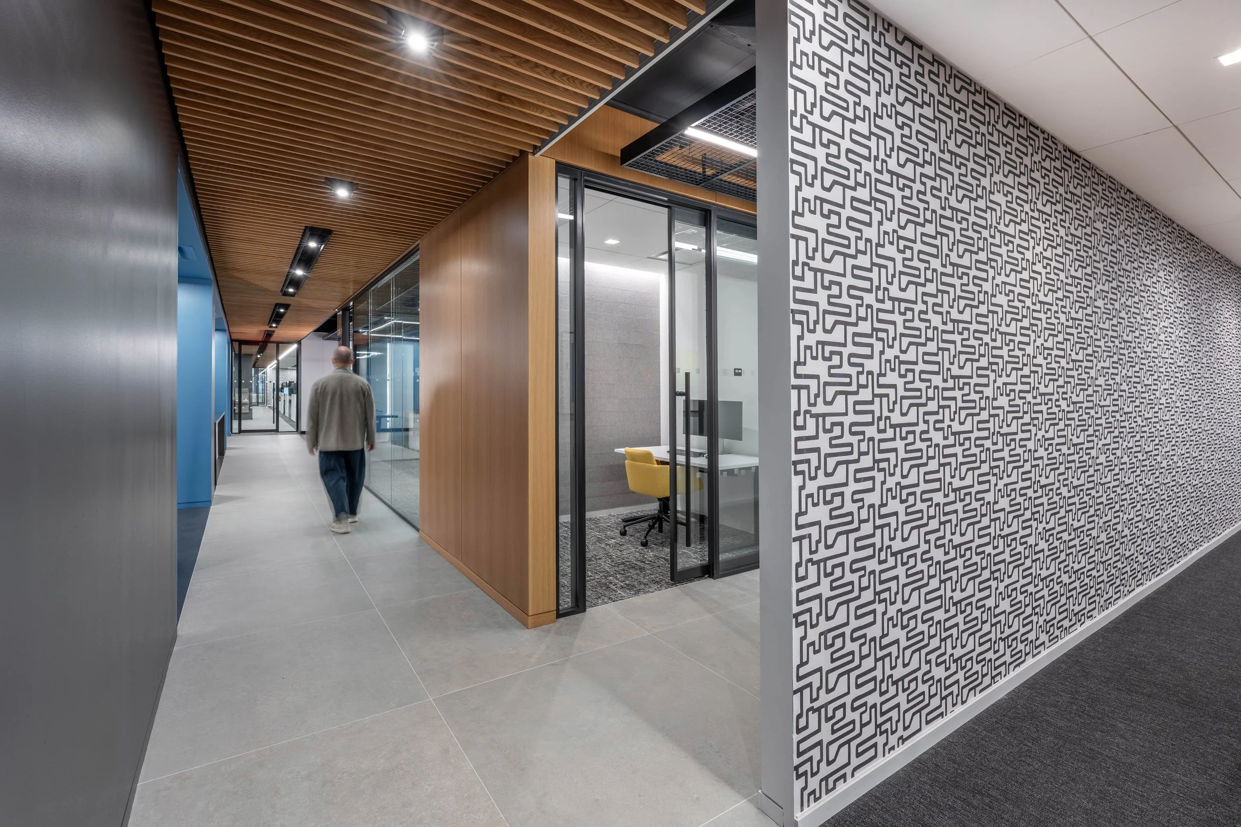We treated circulation as an opportunity to enhance the spatial identity. Wood slats introduce rhythm and contrast against the exposed ceiling, softening the linearity of the corridor. Glass-fronted offices maintain visual transparency and allow daylight to reach deeper into the floor plate. The corridor becomes more than a passage; it reinforces the sense of openness and organization.