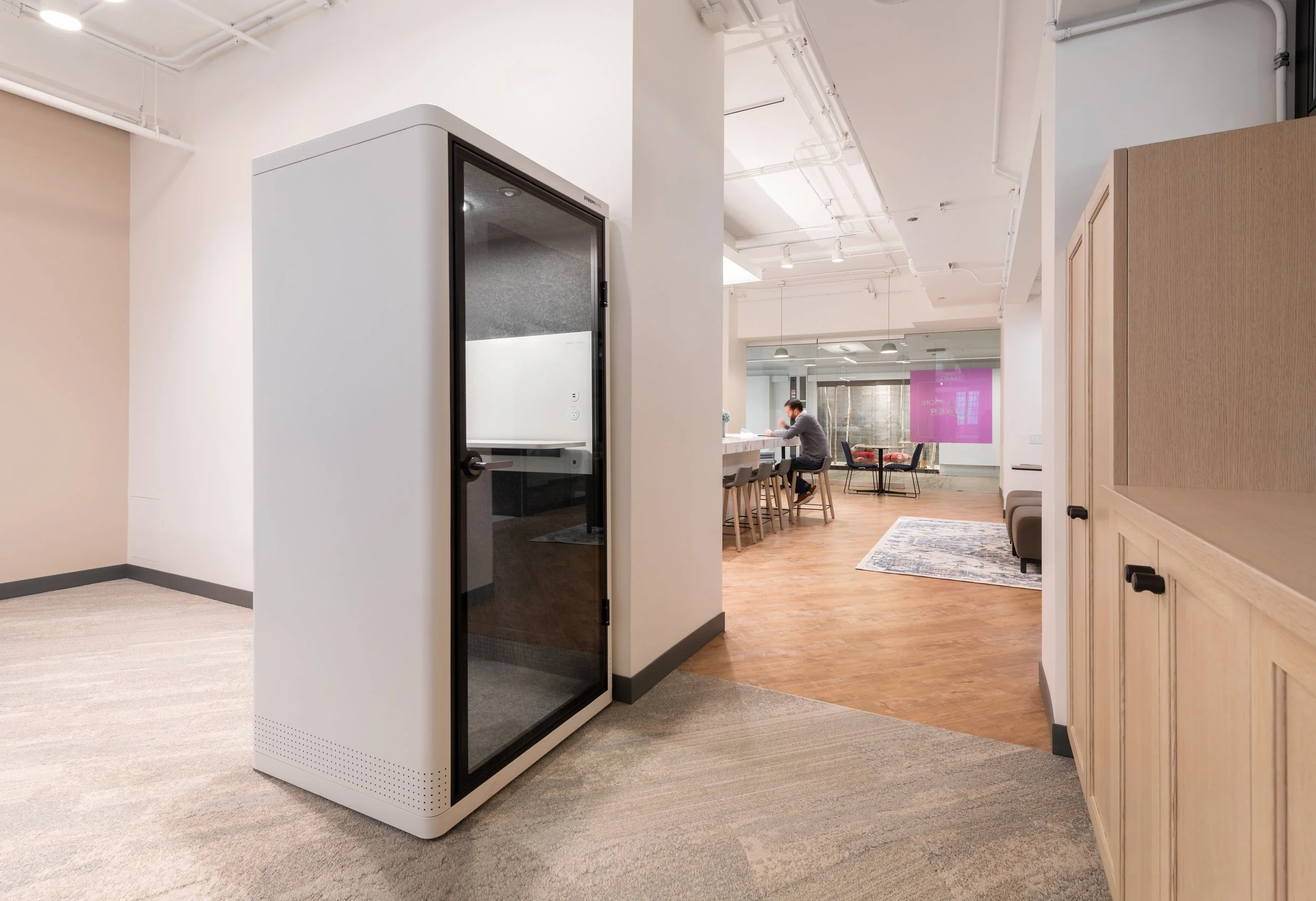 The workplace supported a variety of work styles and collaboration types. The wood flooring was maintained and new area rugs, casual furniture and lighting were added for creative interest in collaboration zones.